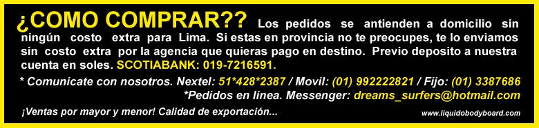 COMO COMPRAR??? Los pedidos se antienden a domicilio sin ningún costo extra para Lima. Si estas en provincia no te preocupes, te lo enviamos sin costo extra por la agencia que quieras pago en destino. Previo deposito a nuestra cuenta en soles. SCOTIABANK: 019-7216591. Comunicate con nosotros: Next: 428*2387 / Movil: (01) 992222821 / Fijo: (01) 3387686 / dreams_surfers@hotmail.com ¡Ventas por mayor y menor! Calidad de exportación. For sales to USA and the rest of the world, write to the e-mail: dreams_surfers@hotmail.com The orders come in the edge of his house.